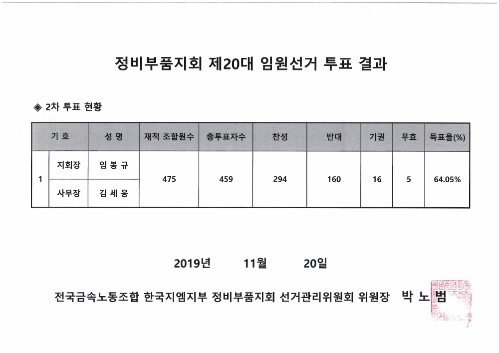 Á¤ºñºÎǰÁöȸ 20´ë ÀÓ¿ø¼±°Å ÅõÇ¥ °á°ú