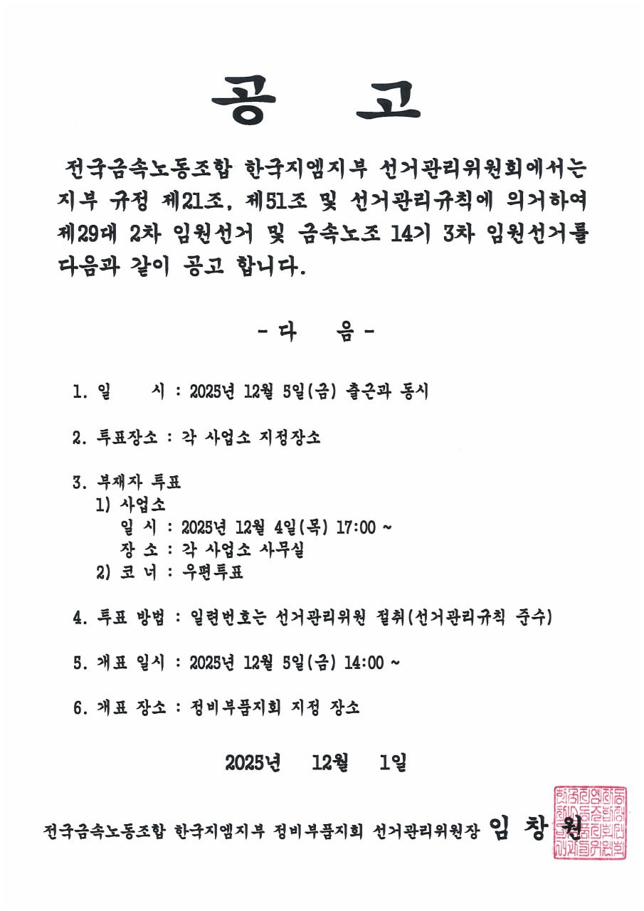 Á¦ 29´ë 2Â÷ ÁöºÎ ÀÓ¿ø¼±°Å °ø°í ¹× ±Ý¼Ó³ëÁ¶ 14±â 3Â÷ ÀÓ¿ø¼±°Å °ø°í